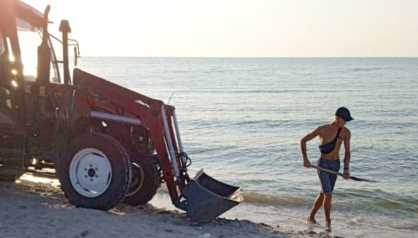 У Кирилівці прибирають медуз із центрального пляжу за допомогою трактора місцевих комунальників.
