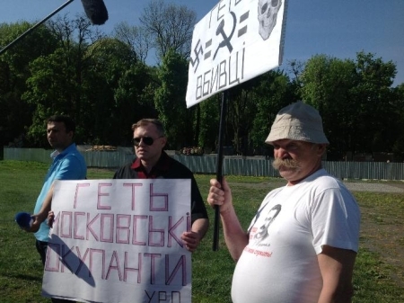 Як передає агентство "Інтерфакс-Україна", молоді люди тримають плакати з написами "Москалі, гоу хоум!", "Геть, вбивці!" із зображенням свастики, серпа і молота і черепа з кістками.
