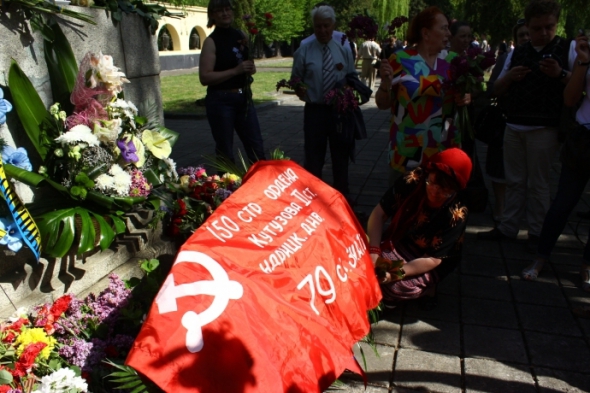 По закінченню урочистостей з нагоди 68-ї річниці перемоги у Великій Вітчизняній війні на Пагорбі Слави у Львові двоє людей розгорнули антикомуністичні плакати.