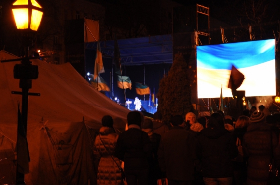"До нас підходять записуватися їхати на Київ молоді дівчата і старші жінки. А тут я бачу багато чоловіків. Невже ми будемо пускати дівчат у дорогу, а самі будемо у Львові грітися? Наш майдан – це живлення київського, його підтримка, але усі важливі рішення приймаються там, і там має бути основна сила. Готуйтеся до того, що ми будемо стояти ще довго. Збір щодня о шостій, а у четвер тут запалимо євроялинку. Якщо треба – тут будемо святкувати усі новорічні свята", - звертається із сцени до натовпу співкоординатор львівського євромайдану Роман Брезіцький.