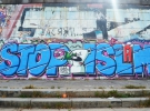 Посередині між словами "Стоп" та "іслам" намальований білий ведмедик із базукою, з якої, замість ракети, виглядає свиня. Коментувати свій приїзд та роботи художник відмовився.