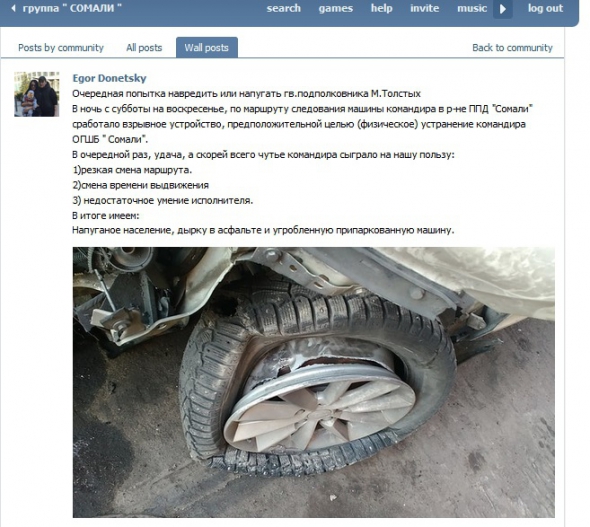 "Чергова спроба нашкодити або налякати гв. підполковника Михайла Толстих. В ніч з суботи на неділю на маршруті транспортування машини командира в районі ППД "Сомалі" спрацював вибуховий пристрій, імовірною метою було (фізичне) усунення командира ОГШБ "Сомалі", - написав він.