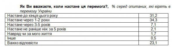 31% з тих, хто вірить у перемогу України над Росією, вважають, що вона станеться до кінця цього року. 34% вважають, що вона настане через рік - два. Ще 7% переконані, що для цього знадобиться від трьох до п'яти років.