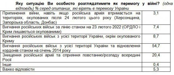 Більшість опитаних (55%) каже, що перемогою можна буде вважати вигнання російських окупантів з усієї території України й відновлення кордонів станом на січень 2014 року. Ще 20,5% навіть радикальніші – перемогою у війні для них буде знищення російських загарбників і сприяння повстанню або розпаду всередині РФ.