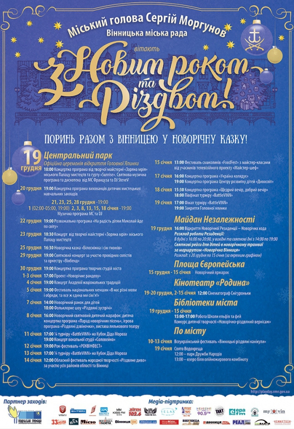 На новорічні та різдвяні свята з бюджету Вінниці буде виділено 211 тис. грн. Таку ж суму нададуть спонсори. Місто прикрасять новими святковими прикрасами й ілюмінацією. Про це Gazeta.ua повідомив міський голова Сергій Моргунов.