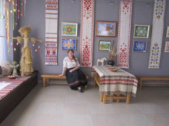 "У нас є багато весільних рушників. Їх особливість у тому, що має бути чоловічий і жіночий бік, на одному краю вишивали курочку, а на іншому півника. Часто вишивають дерево життя. Складається з 3 ярусів: минулого, теперішнього і майбутнього - планів, мрій. У нас є зразок цікавого рушника з Чернігівщини. На ньому зображені два орла спиною один до одного, цей символ називають берегинею".