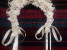 "Найбільше робила весільні вінки. Каркас роблю з дроту, квіти з лляної тканини і воску, інколи прикрашаю пружинками. Віск часто замінюю сумішшю крохмалю та клею ПВА, можна додавати барвники для кольору. Єдиний недолік у тому, що такий вінок трошки важчий, зате не плавиться на сонці і міцний".