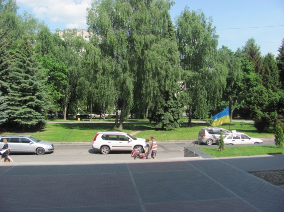 Останнім пунктом реєстрації звернення до президента була обласна державна адміністрація. Проте міліція не пропускала активістів у фойє приміщення. Чому не пускають волонтера, який щотижня на власному автомобілі возить на схід допомогу бійцям, міліціонер не пояснив. За кілька хвилин до автомайданівців вийшов начальник відділу звернень громадян ОДА Віталій Кудринецький.