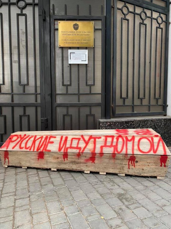Дерев'яну труну з червоними написами "Вантаж 200" і "Росіяни йдуть додому" чоловік розмістив перед входом у консульство.