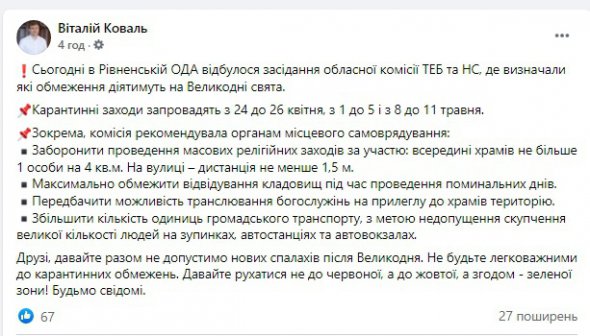 Додаткові карантинні обмеження на Великодні свята запроваджує влада Рівненської області.