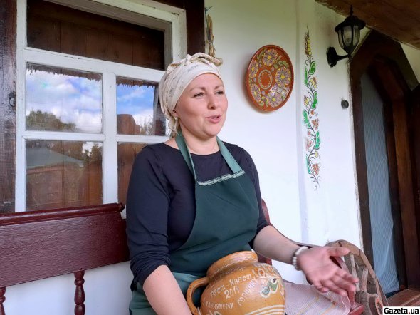 Говоримо з Мариною на піддашках хати 1914 року, однієї з будівель етнопоселення "Старий хутір" в Опішні. Зауважую, як пасує смарагдовий робочий фартух жінки до її зелених очей. Марина сидить на автентичній лаві зі спинкою, критою тканим рядном. Тримає в руках полив'яний горщик з традиційним опішнянським орнаментом і написом "2014. Фест-квест Борщик у глиняному горщику".
