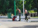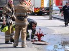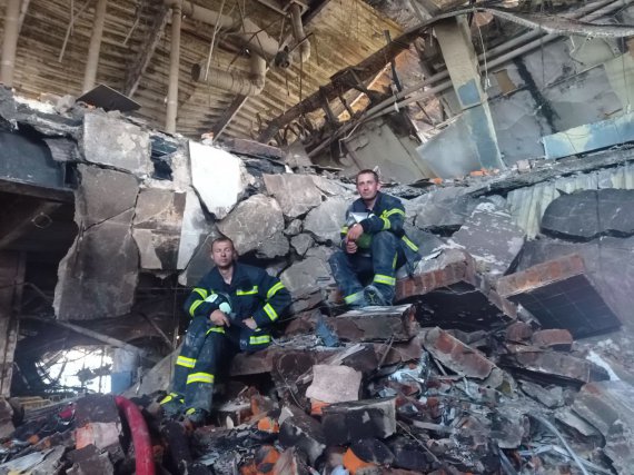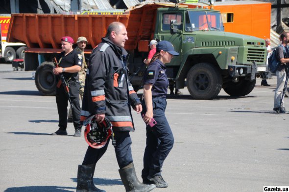 І без того важкі умови роботи рятувальників на згарищі ускладнює погода – палюче сонце й висока температура повітря. Щоб освіжитися, рятувальники знімають важкі захисні костюми й приходять облитися холодною водою з пожежного гідранта на майданчику біля зруйнованого ТЦ.