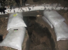 Боєць проводить до копаночки, її глибина метрів зо три, ширина з півтора. Туди спускаємося земляними сходами. Вже темно, Олег присвічує фонариком на телефоні. Зверху копанка теж прикладена мішками з піском, всередині - дерев'яний щит - то лежанка. Неподалік - вкопаний броньовик. Поряд із шалашем - стіл. Хлопці жартують, що це у них бар. Неподалік на вогнищі солдати смажать карасів на вечерю.