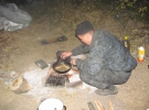 "Рибку нам місцеві принесли, - продовжує. - Якби не волонтери та місцеві мешканці - не вижили б. Мій родич Володимир Штефанюк - сільський голова в Гордіївці, звідки я родом, то ніколи нічого не передає. Міг би хоч людей в селі організувати. Оце так - ми тут все закінчимо, не підемо посеред дороги і не здамося. Те, що на морозі в землянках - не лякає, вже звикли. Будемо стояти, поки не зітремо все з лиця землі тут. А потім підемо по районах, областях та в столицю. Запитаємо у влади, чого стільки наших хлопців гине під час перемир'я. І чого в годину тиші нас валять із важкої артилерії".