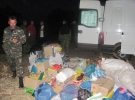 Волонтери розвантажують мішки та ящики. Крім продуктів, привезли теплий одяг та взуття