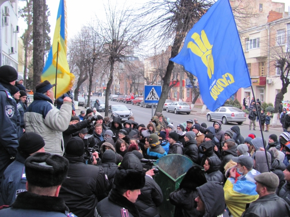 "Геть Моренця із посади начальника обласного управління. Вимагаємо його відставки, бо за місяці роботи він себе ніяк не проявив, не сказав, яку політику буде підтримувати. А сьогодні в один ряд з міліціянтами поставив тітушок проти людей, які мали бажання зайти на сесію. Тітушок, які вбивали свого часу людей на Майдані. Начальник міліції - виборна посада, ми виберемо свого, народного очільника міліції", - закликає свободівець, екс-нардеп Олексій Фурман.