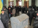 "Банда і міліція - одна коаліція", - з таким скандуванням майданівці оточують обласне управління МВС, навпроти якого розташований музично-драматичний театр. Саме з його двору активісти волочуть порожній сміттєвий бак.