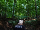 У лісі розташована літературна галявина. Дорогою люди роздивляються виставку світлин від Українського інституту національної пам'яті.
