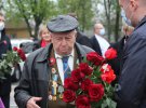 І двоє ветеранів Другої світової війни. Їх привезли автівкою родичі. В одного з них під чорною шкіряної курткою костюм кольору хольору хакі в дрібну смужку. На піджаку приколоті декілька десятків орденів та медалей. Чоловік бере до рук букет червоних троянд і декілька тюльпанів. Повільним, але впевненим кроком займає своє місце в процесії для покладання квітів.