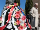 Близько 10.30, до меморіалу поспішає чоловік років 60, називається Олександром Косторним. Вже майже на сходах, біля самої охорони, чоловік чіпляє собі на груди георгієвську стрічку. До нього одразу поспішають чоловіки у камуфляжній формі. Просять зняти комуністичний символ.