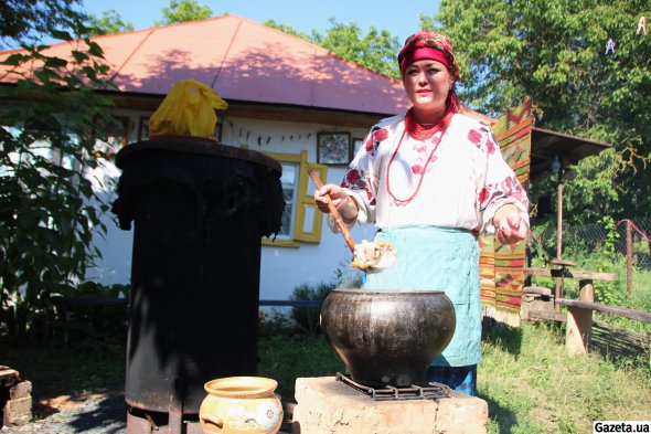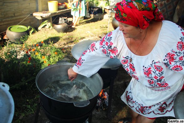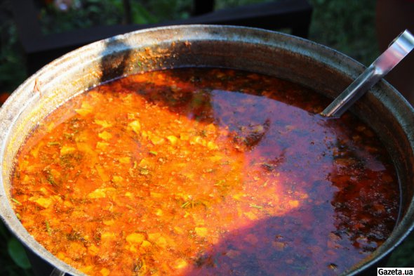 - Наша коронна страва, з якою ми другий рік поспіль беремо участь у цьому фестивалі - мисливський борщ. В нашому колективі є мисливець, він одного прекрасного дня встрелив десь у кукурудзі свинку. На її ребрині ми й варимо борщ. На відміну від домашньої свині, в дикой м'ясо не біле, а червоне, - каже полтавка Лариса Бездудна.
