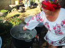Господиня Людмила Галій з Дніпропетровщини готує червоний борщ з буряковим квасом, вареними яйцями та вершками. Виїхали з дому о треній годині ранку.