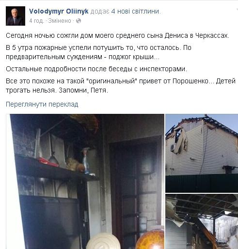 "Сьогодні вночі спалили будинок мого середнього сина Дениса в Черкасах. О п'ятій ранку пожежники встигли загасити те, що залишилося. За попередніми судженнями - підпал даху", - написав Володимир Олійник.