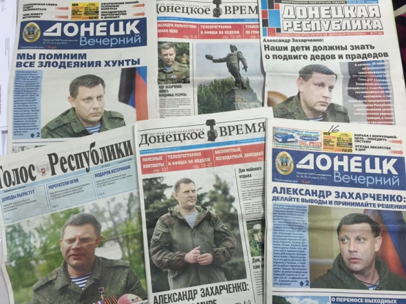 Мацука сфотографував газети, які вийшли в самопроголошеній республіці за останній тиждень. На першій сторінці кожної газети - глава ДНР Олександр Захарченко.