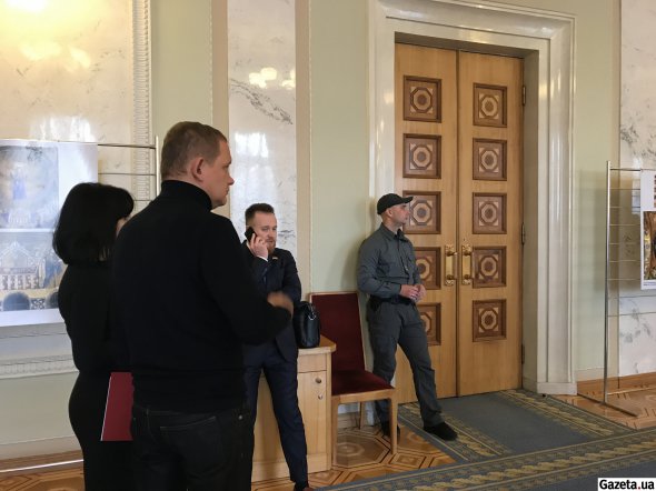 О 9:35 на другий поверх парламенту швидко підіймається Володимир В'ятрович, нардеп він "Європейської солідарності".