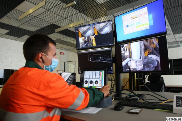 - Буріння виконує робот. Я тільки контролюю. Іноді бувають збої. Тоді треба втрутитися у процес та перевести обладнання у ручний режим, - за столом перед 4 моніторами сидить диспетчер Станіслав Вовк, 48 років. Має пульт управління буровим станком. За допомогою джойстиків, схожих на кермо у літаках Airbus, може перемикати апарат із ручного в автоматичний режим. І навпаки. - На станку у кар'єрі встановлено 4 камери. Бачу все у режимі онлайн. Камеру можна наближати до техніки. Можу глянути, що відбувається із бурінням у напарника і щось підказать.