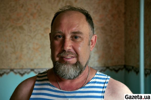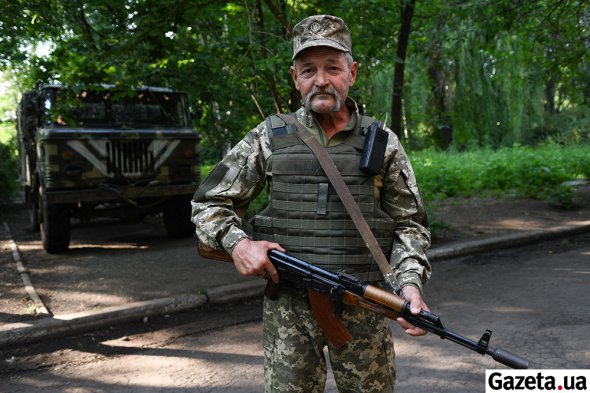 Завожу розмову з бійцем Сергієм, який стоїть у наряді з автоматом. Чоловікові 58 років, має довгі козацькі вуса. Родом із міста Бердянськ Запорізької області, що на узбережжі Азовського моря. До війни працював газорізальником.