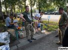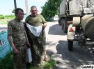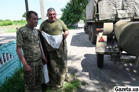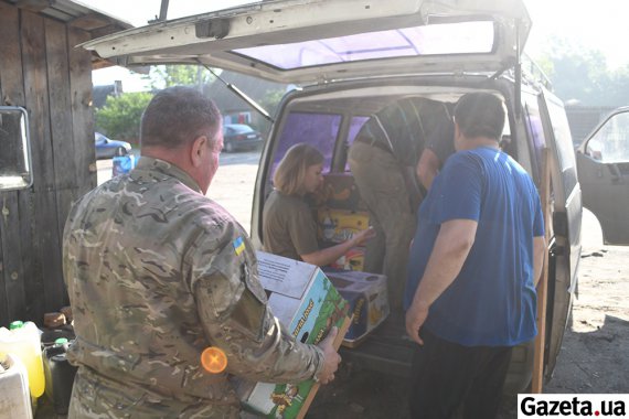 На машині до нас під'їжджає бойовий офіцер Юрій із побратимом. Одягнені в шорти. Незабаром мають вирушити на передову. Віддаємо перший ящик із закрутками і солодощами, відро з м'ясом і свіжу пресу.