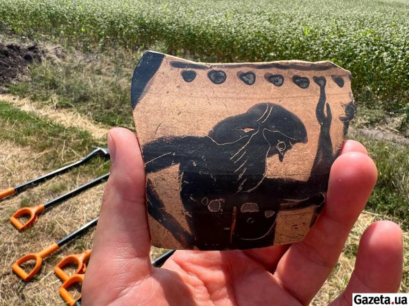 – Бронзова деталь кінської вузди, так звана замочкоподібна бляшка, доволі рідкісна знахідка в цій частині Лісостепу. Це говорить про те, що тут було ще одне місце поселень людей. До минулого року ми не знали про нього. Тут же знайшли рештки античних амфор, що говорить про те, що місцеві торгували з давніми містами. Це – ніжка античної амфори виробництва острова Лесбос. Датується кінцем VI – початком V століття до нашої ери, – показує археолог уламок кераміки.