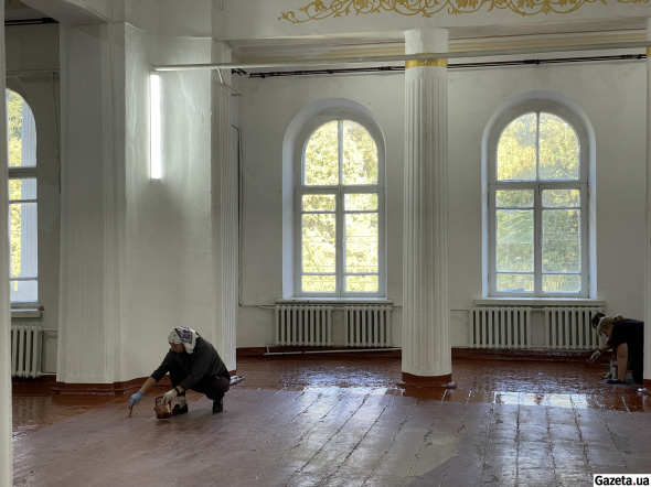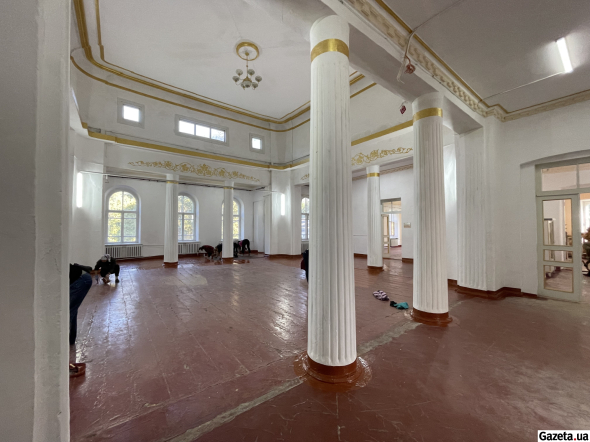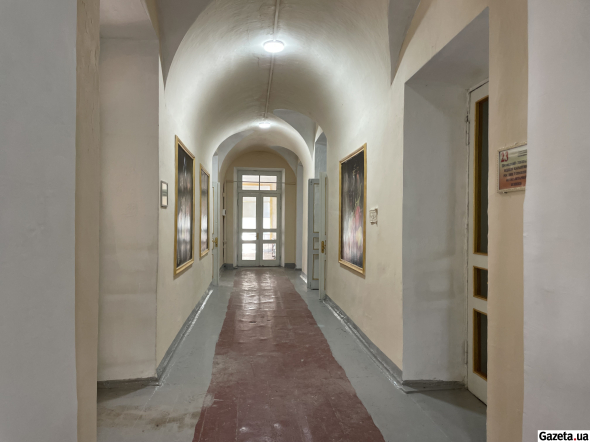На першому поверсі розмістили аудиторії. У деяких встигли пофарбувати підлогу, а в решту перенесли парти й стільці. Стіни довгих коридорів із високими стелями прикрасили картинами у позолочених рамках.