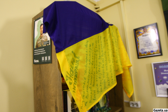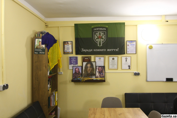 У сусідній кімнаті на стіні розвісили нагороди й подяки від підрозділів і силових структур. Навпроти - біля портретів загиблої Ірини "Чеки" Цибух - на полиці поклали оберемок синьо-жовтих колосків. Трохи вище - прапор батальйону з гаслом "Заради кожного життя".