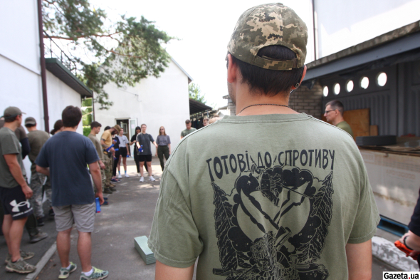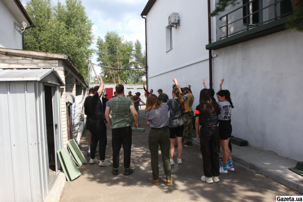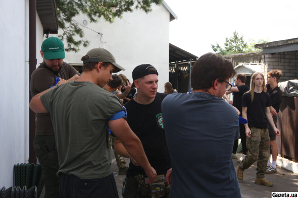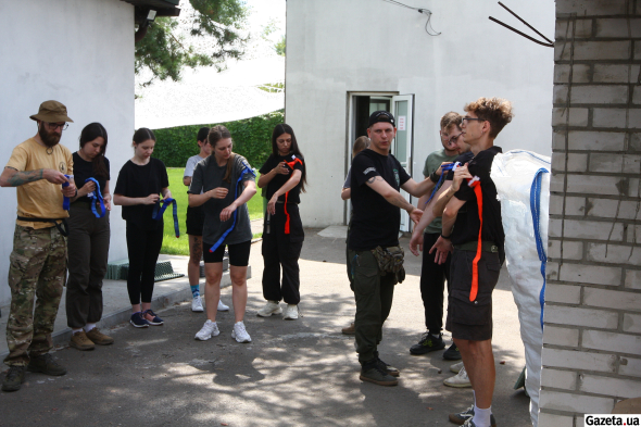 Окрім вишколів, "Госпітальєри" проводять платні навчання різної складності для цивільних. Сьогодні на базі - одноденний курс. Біля навчального центру гомонять чоловіки й жінки, іноді зриваються сміхом або зовсім мовчать. Інструктор Дмитро із позивним "Док" вчить підопічних накладати турнікет.