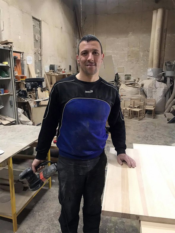 "Намагаємось від початку дати атмосферу довіри, це розслабляє. Тримаємо касу без замка, дорогі інструменти також не закриваються. Даємо новій людині завдання — до кінця дня пошліфувати певну кількість дерева. Пояснюємо, що це важливо, бо завтра хтось інший має його полакувати. Тобто, якщо сьогодні дерево не пошліфують, то завтра в тієї людини не буде роботи. Робітник розуміє, що його обов'язок є важливим і така мотивація дуже працює. Тоді пробуджуємо почуття відповідальності", - каже Андрій, дивлячись на відходи, які лежать на підлозі.
