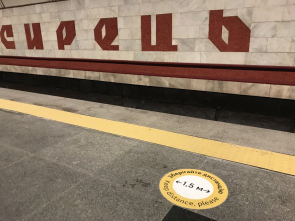 Сирець - кінцева зупинка зеленої лінії метро, але в час пік тут завжди повна платформа пасажирів. Сьогодні їх не більше десяти. Розходяться так, щоб сісти кожен в окремий вагон. На платформі розклеєні жовті круглі плакати-нагадування про те, щоб дотримуватися дистанції в 1,5 м. Тишу станції розриває гул приближення потягу. Вагони чисті. Реклами немає ні на вікнах, ні на дверях. Навіть рекламні екрани вимкнені. У повітрі запах хлорки та спирту. У гучномовець на кожній станції нагадують "Надягайте, будь ласка, маски. Поважайте інших".
