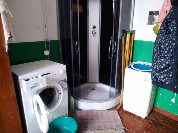 В наступній кімнаті загального користування стоїть шафа та акуратно заправлене залізне ліжко. Працює душова кімната з прозорими дверцятами. З обох боків – пральні машинки.