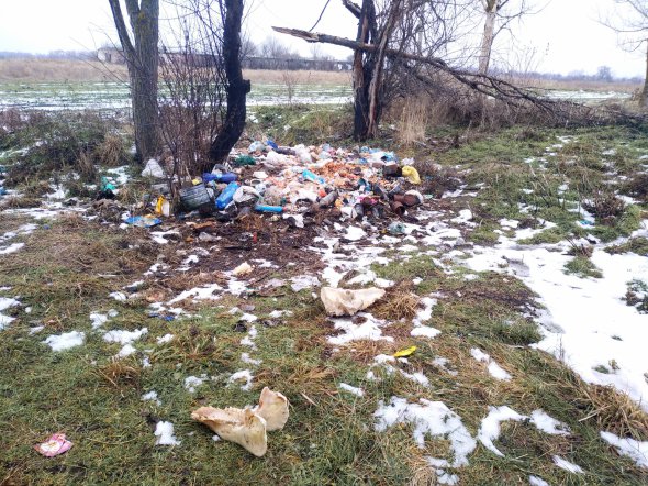 За сараєм на землі – смітник. Рівним шаром розкидані харчові відходи, пакети, пляшки з-під горілки, банки та кришки з-під консервації.