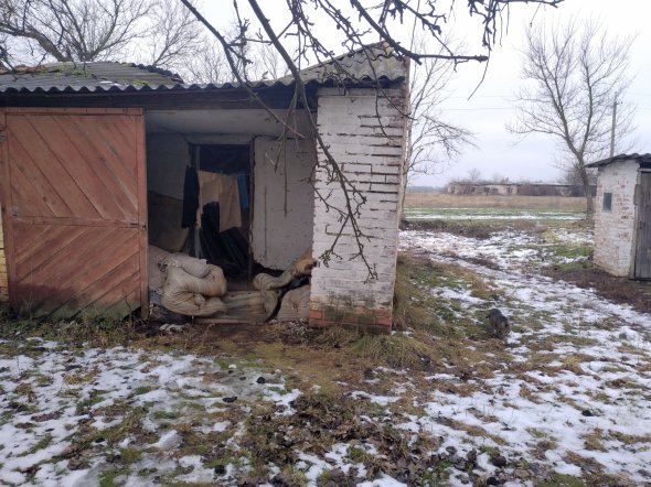 В сараї провалився дах, вивалилася стіна. Купою навалені старі ватяні матраци, якесь лахміття. Між стінами розтягнута мотузка, на ній сушаться запрані ганчірки і жіноче спіднє.