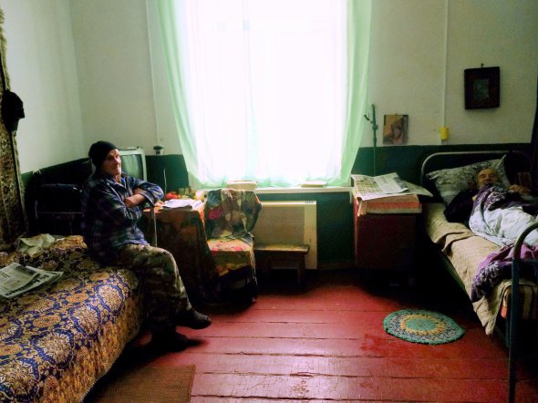 Ліворуч біля входу ліжко 67-річного Віктора Богданова. Живе тут близько 4-х років. Чоловік лежить, закрившись ковдрою до неголеного підборіддя.