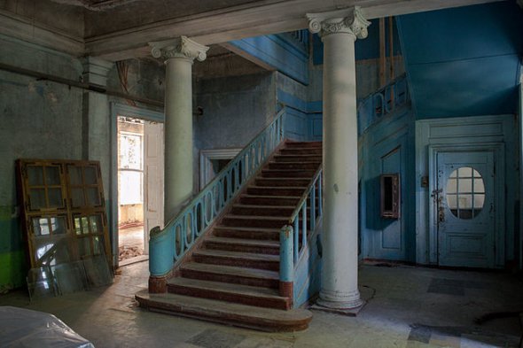На першому поверсі подекуди зірвана підлога. Піднятися на гору можна дерев'яними сходами. В очі кидається напис російською на стіні - "Политбюро ЦК КПСС". Це нагадування, що колись у будинку розміщувався будівельний технікум.