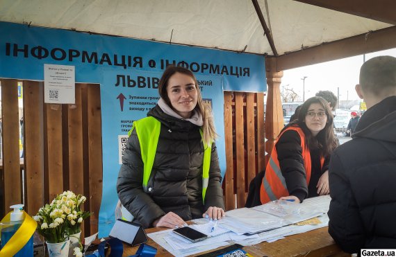 На площі Двірцевій - багатолюдно. Перед входом до вокзалу стоять намети, в яких волонтери допомагають переселенцям з пошуком житла у Львові та надають інформацію щодо рейсових автобусів в Івано-Франківськ, Тернопіль і на Закарпаття. Записують у чергу на безкоштовні потяги та автобуси до Польщі.