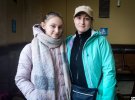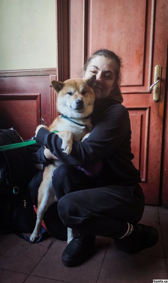 Біля входу у зал сидить переселенка Юлія із Запоріжжя. Біля неї дві собаки породи акіта-іну. Вистрибують жінці на руки, ластяться, облизують обличчя. Із псами та донькою, 18-річною Діаною, їдуть до друзів у Львівську область.
