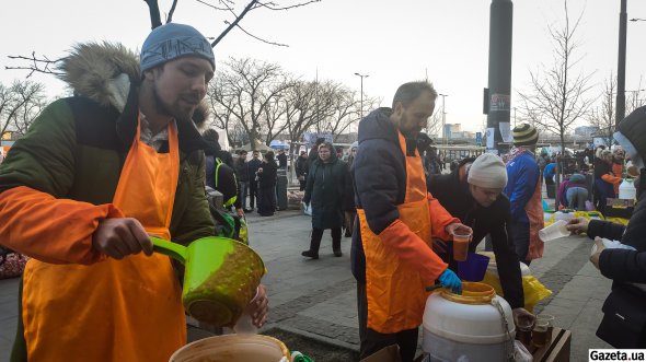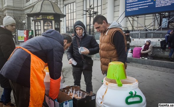 30-річний Володимир Бартика розливає у пластикові стакани з великої білої банки гарячу овочеву зупу. Передає наповнену тару людям, які стоять в черзі біля вокзалу. Страва пахне апетитно.