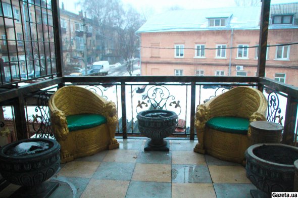На цьому ж майданчику є вихід на балкон — металопластикові скляні двері, обкладені світлою сучасною плиткою дві сходинки, стоять три вазони із живими квітами. За склом помітні три позолочених бетонних крісла у псевдоантичному стилі, вазони з порожньою землею.