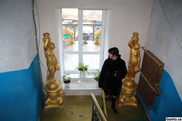З ним і співвласницею квартири №9 Тетяною Муравльовою зустрічаємося біля під'їзду. Яскрава брюнетка в короткій чорній шубі натурального хутра теж приязно усміхається. Залюбки погоджуються розповісти історію апартаментів. Та одразу зауважує: показати квартиру мені не зможуть, бо там зараз чергові пожильці.