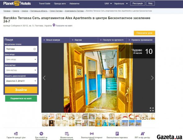 Ідеться про апартаменти, які на сайтах бронювання готелів мають гучну назву Barokko Terrassa (написання назви готелю збережене. — Gazeta.ua). Вже декілька років про них говорять далеко за межі Полтави.