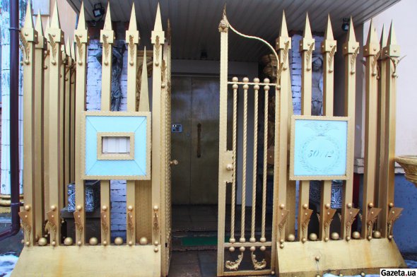 Перший під'їзд вражає кількістю золотої фарби. Навколо входу височіє огорожа із загостреними піками, прикрашена декоративними листками й кулями. Майже впирається в перекриття тераси другого поверху. За частоколом — критий простір. Тут підпирають порожнечу статуї — атланти й каріатиди.